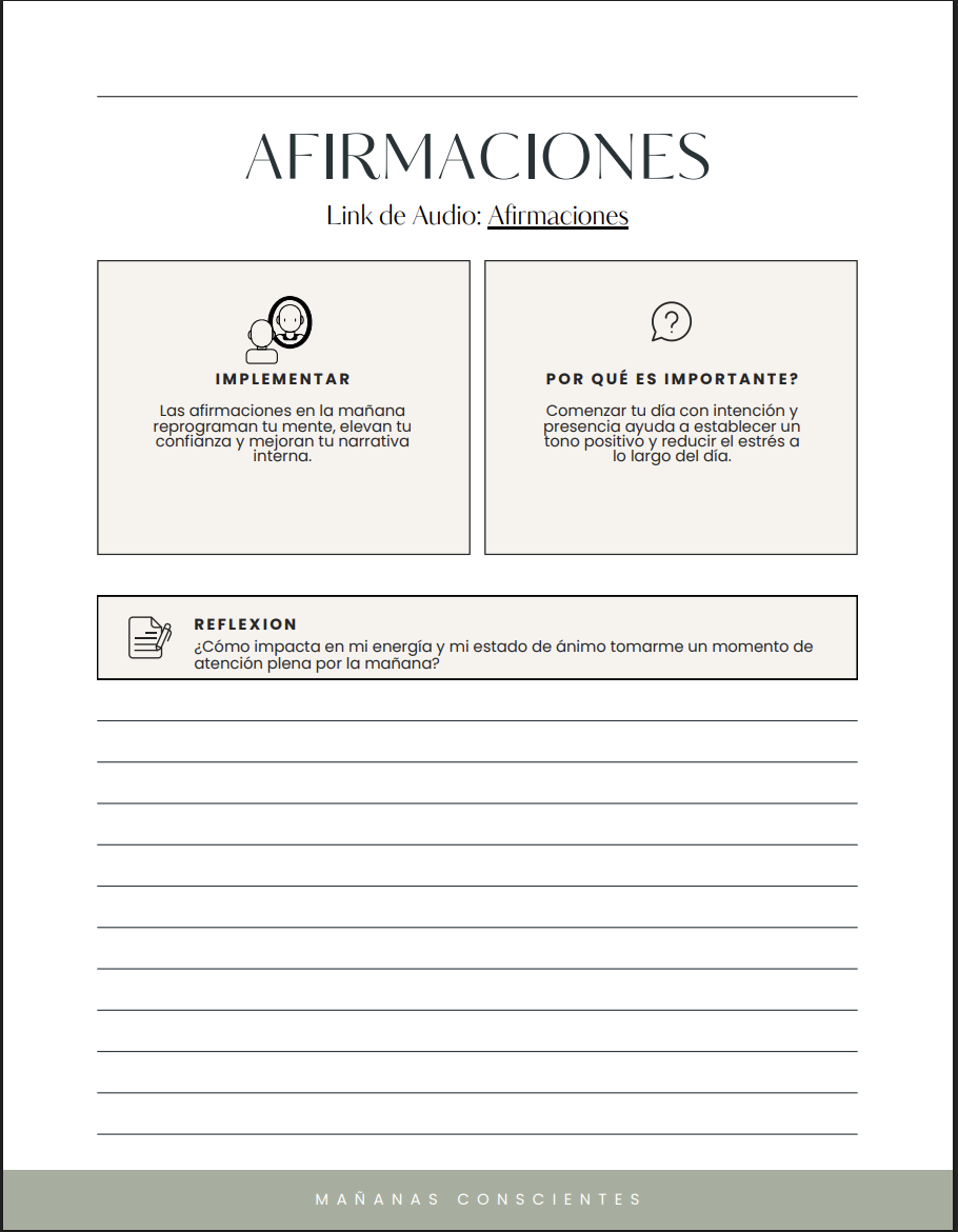 Porque está diseñado para aprovechar los primeros minutos del día, cuando tu mente subconsciente es más receptiva. Así, podés reprogramar tus creencias, elevar tu energía y establecer un tono positivo para todo lo que viene.